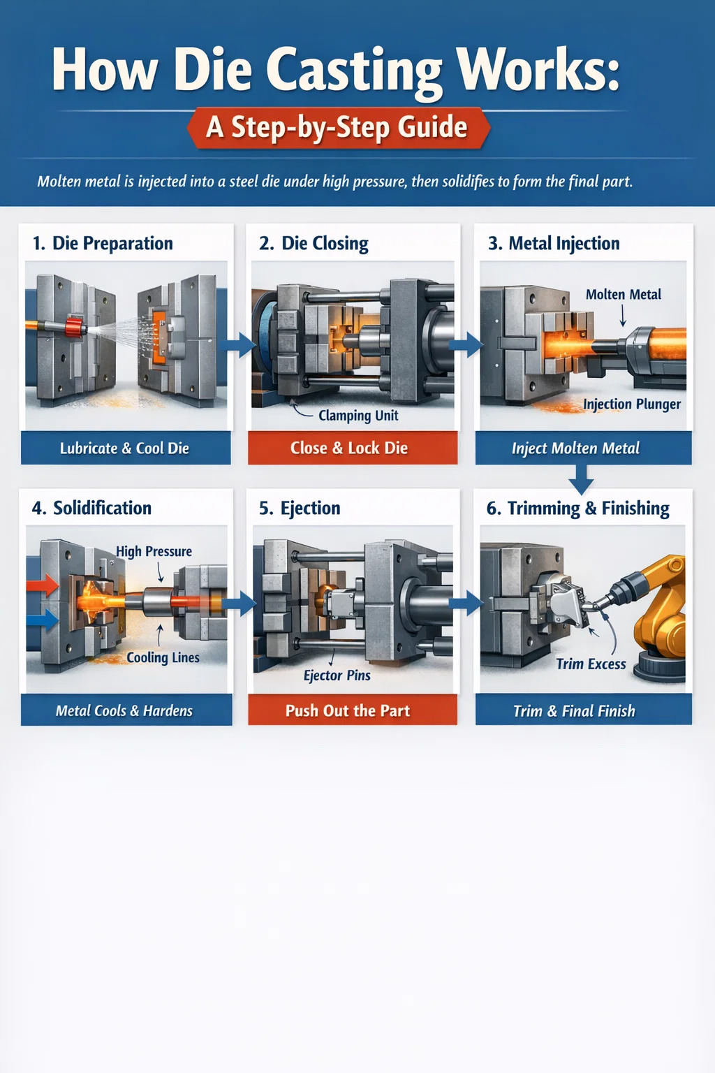 Die casting ay isang proseso ng pagbuo ng metal kung saan ang nilusaw na metal ay itinuturok sa ilalim ng mataas na presyon sa isang tumigas na bakal na amag — tinatawag na die — at pinananatili doon hanggang sa tumigas ang metal sa eksaktong hugis ng lukab. Kapag solid na, bubukas ang die, itinutulak ng mga ejector pin ang bahagi palabas, at magsisimula muli ang cycle. Maaaring ulitin ng isang die ang sequence na ito daan-daang libong beses bago ito maubos.