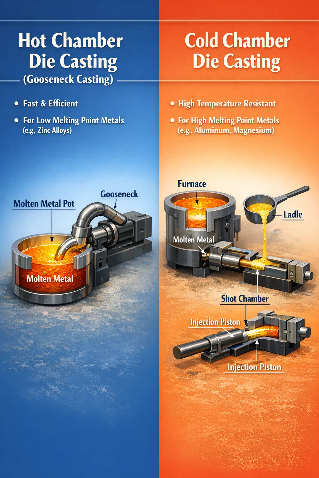| Angkop na Mga Metal | Mga metal na may mababang tuldok ng pagkatunaw tulad ng Zinc at Tin. | High melting point na mga metal tulad ng Aluminum, Magnesium, at Copper. |