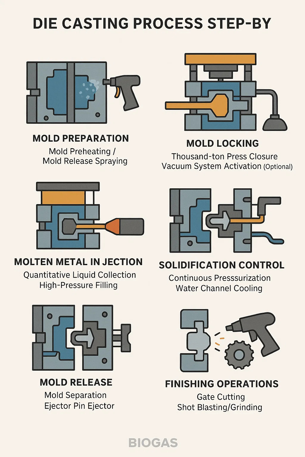 Pagpuno ng High-Pressure: Ang isang plunger ay nag-inject ng tinunaw na aluminyo sa lukab ng amag sa bilis ng kanyon (30-100 m/s), pinupuno ang lukab sa loob ng 0.01-0.3 segundo.