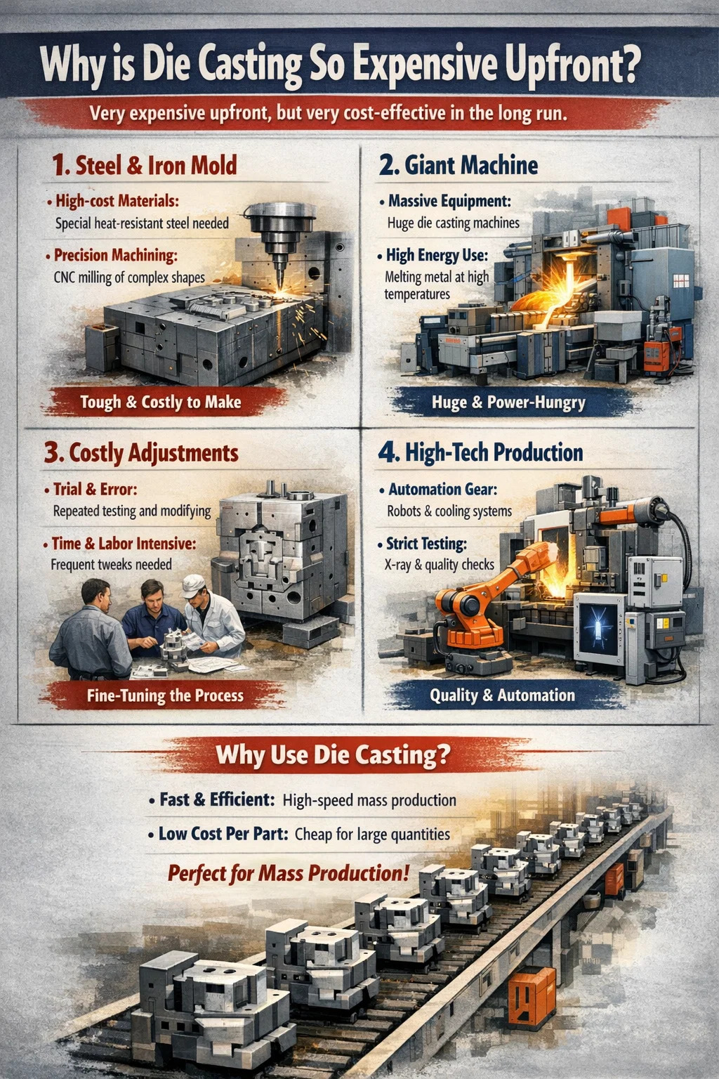 Sa katunayan, die casting ay talagang isang proseso na "napakamahal sa harap, ngunit napaka-epektibo sa pangmatagalan." Ang mataas na halaga nito ay pangunahing makikita sa paunang pamumuhunan. Maaari naming hatiin ang prosesong ito: