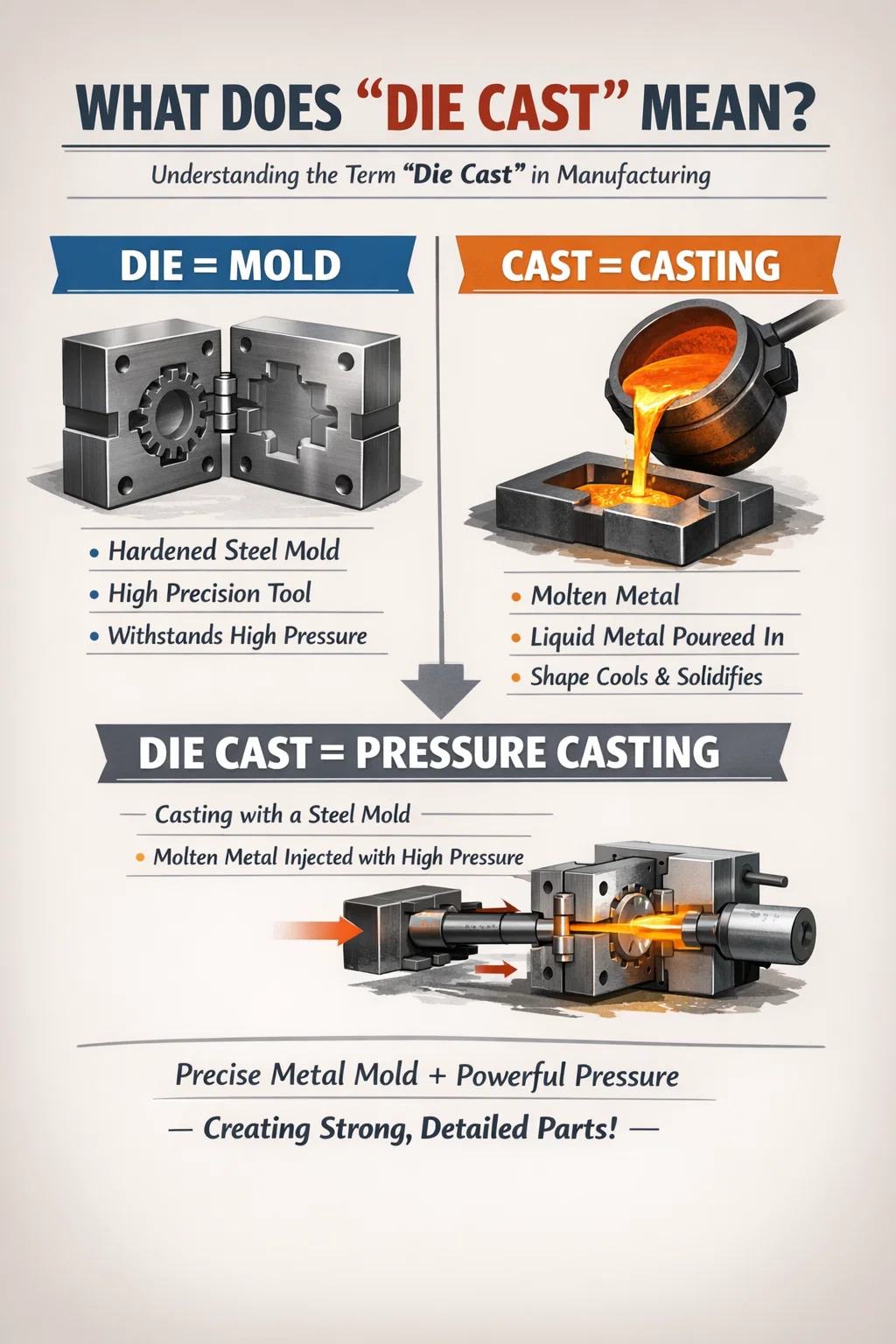 Ang pagsasama-sama ng dalawang salitang ito sa "die cast," ang pangunahing kahulugan ay: pressure casting gamit ang isang tumpak na metal na amag.